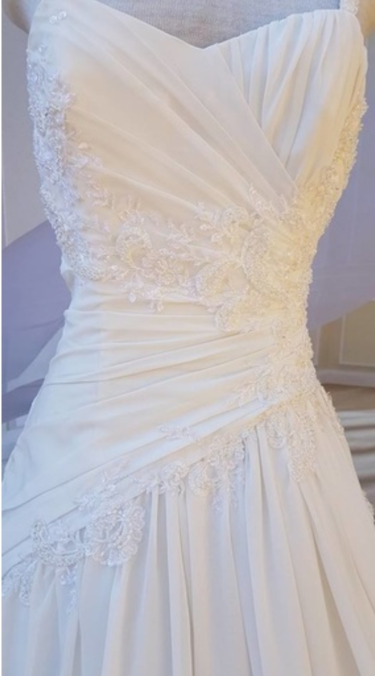 Gail is an elegant A-line gown perfect for brides looking for beautiful silhouette on their wedding day. Gorgeous lace embellishments with beads and pearls details over soft chiffon accentuate your bust line and slim waist. A timeless and elegant option for your wedding gown.