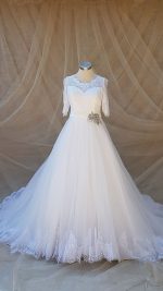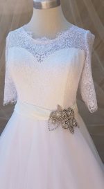 Elegant sophistication is the best way to describe Leanda. This is a stunning gown that will take your grooms breath away. Perfect for brides looking for a timelessly elegant gown, with its fabulous French lace detail and added broach detail to the waist.